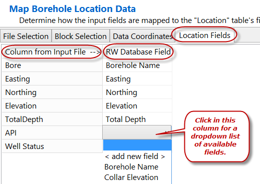 - Location Fields タブでは、Excel の Location シートの列を RockWorks の Location テーブルのフィールドに割り当てることができます。デフォルトでは、Location テーブルのみにこのオプションが有効になっています。(他のテーブルにも適用したい場合は、Block Selection タブの Show Block Mapping ボタンで、選択したテーブルに対してこのオプションを有効にしてください。)さらに、Location Fields タブでは、既存のボーリング孔への新しいデータのインポート方法も指定できます。