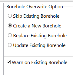 - Borehole Overwrite Option セクションでは、既存のボーリング孔データのインポート処理に関する方法を指定します。