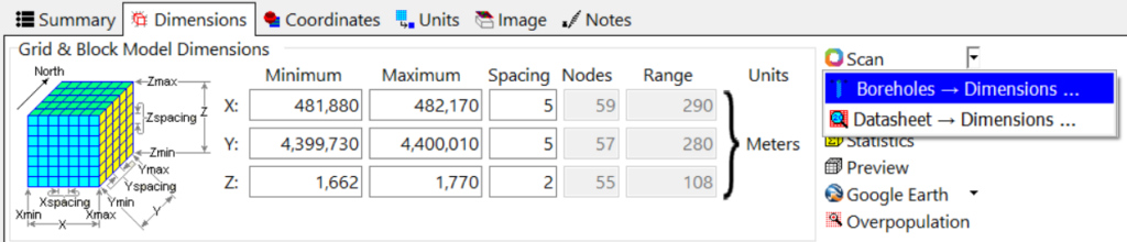 - Scan | Boreholes -> Dimensions を選択して、Set Dimensions from Borehole Data メニューを表示します。