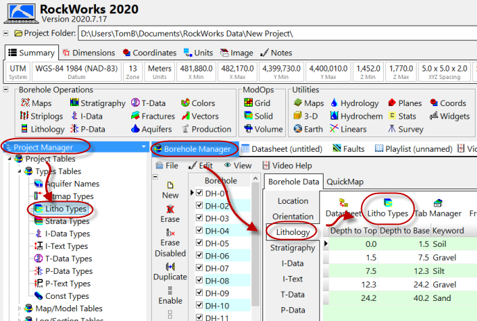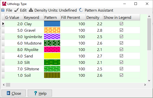 Project Manager の Litho Types テーブルをダブルクリックするか、Borehole Manager の Lithology テーブルをクリックして、Lithology Type テーブルをクリックして表示します。