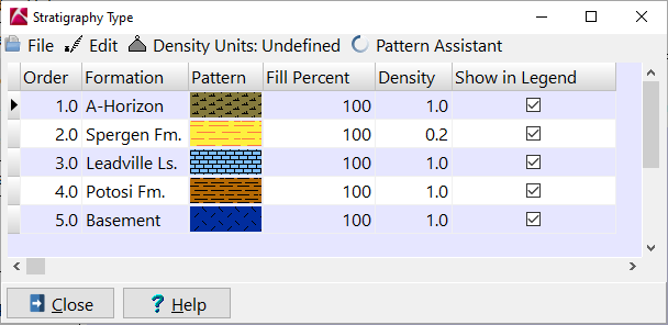このテーブルには、それぞれ異なる Order、Pattern、カラーを持つ5つの層がリストされています。Formation 列の名称は、インポートした Excel ファイルの Stratigraphy シートに記載されている名前から追加されています。
