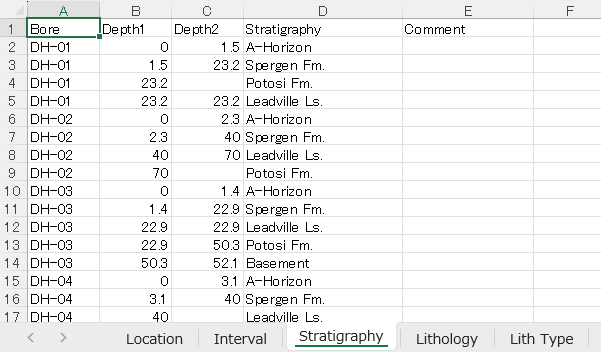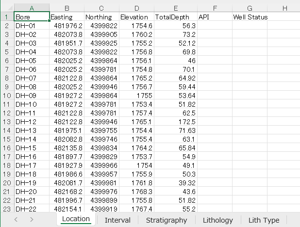 RockWorks でインポート可能な形式の一つに、「マルチシート」の Excel 形式があります。この形式はデータベース形式を反映しています。Excel シートは RockWorks のデータベーステーブルに対応し、各列はテーブル内の異なるフィールドに対応しています。この演習では、Excel でファイルを表示し、ステップ1で作成した新しいプロジェクトにインポートします。