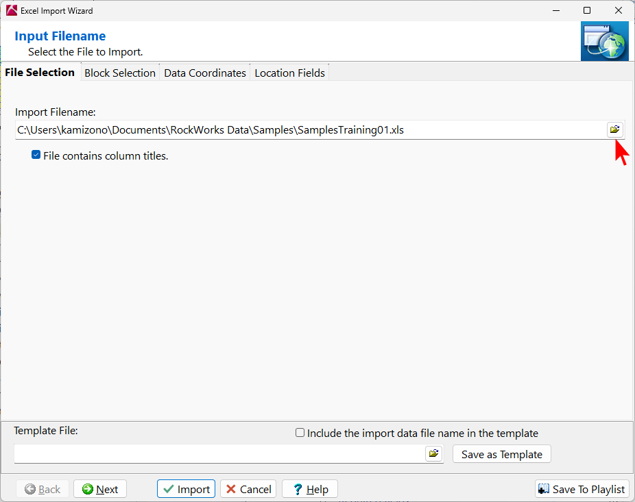 アイコンをクリックします。1つ上の階層の \RockWorks Data\ フォルダに移動し、\Samples\ フォルダをダブルクリックして、SamplesTraining01.xls ファイルを選択し、「開く」をクリックします。