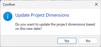 - RockWorks によりデータがインポートされ、Confirm | Update Project Dimension ウィンドウが表示されます。Yes をクリックすると、Output Dimensions が表示されます。