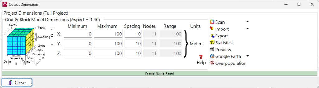 - Output Dimensions ウィンドウの計算されたプロジェクト寸法をご確認ください。ボーリング孔の XYZ 座標と一致するように変更されています。