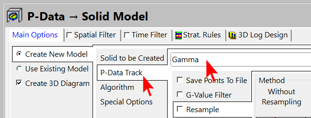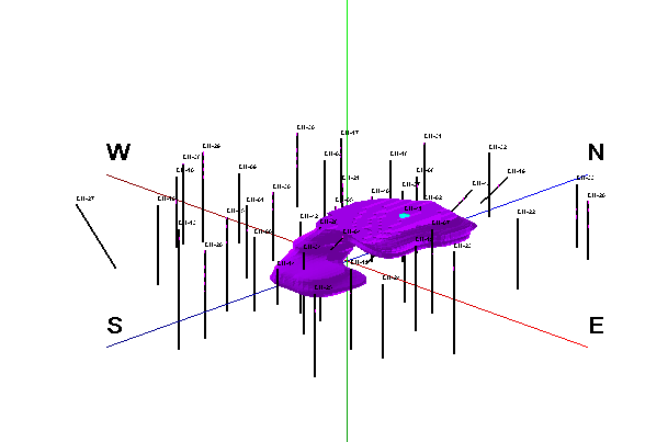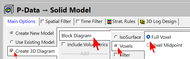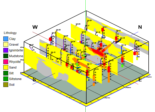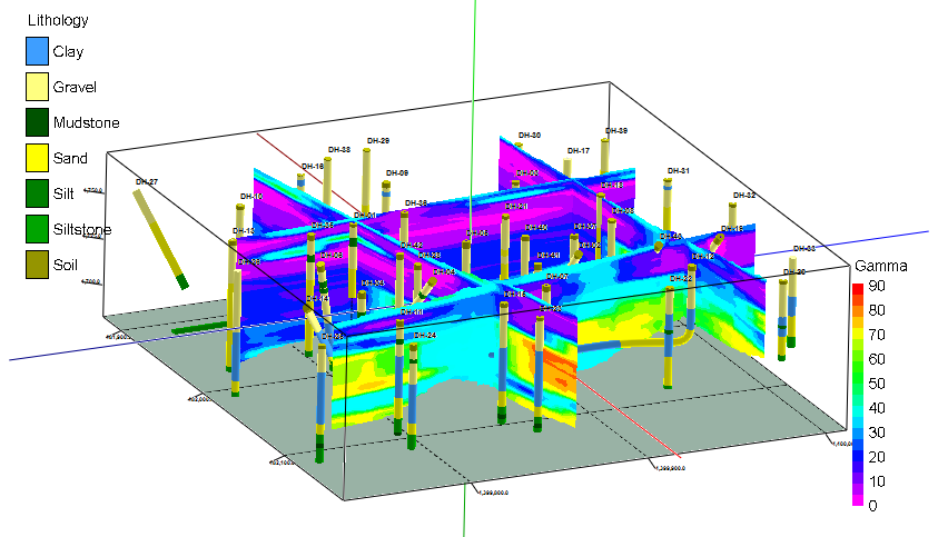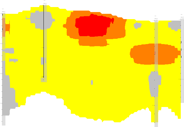 この手法では Inverse Distance (逆距離補間法) を使用しますが、各ボクセル値を計算する際に使用するコントロールポイントは、最近傍の8点のみ使用します。利用可能な各種補間法の詳細な説明は、RockWorks のヘルプファイルに記載されています。