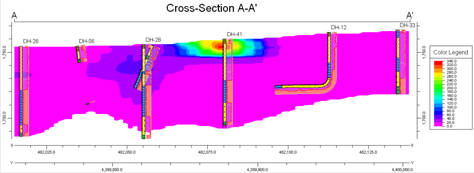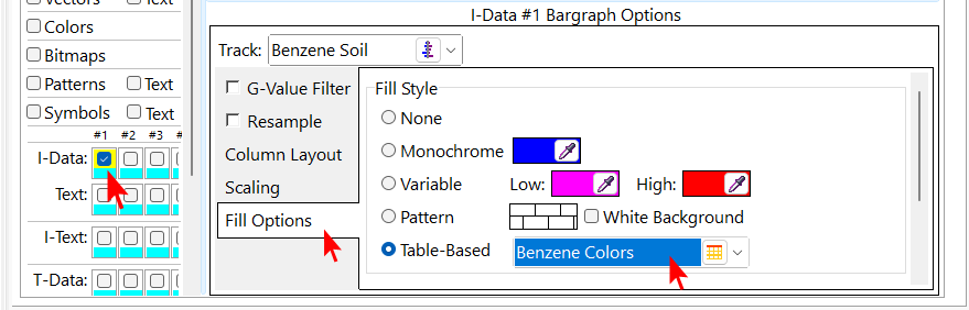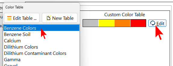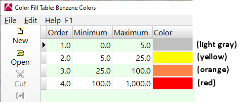 Borehole Manager によって自動的に割り当てられるカラースキームは、特定のデータセットでは適切に機能しません。このような場合は、可視化に使用するカスタムのカラーフィルテーブルまたはコンターテーブルを作成する必要があるかもしれません。カスタムテーブルを使用すると、対数間隔または不規則な間隔を使用してデータやモデルを可視化できます。ここでは、ベンゼンの値のカスタムカラーテーブルを作成し、それを使用して I-Data プロファイル、フェンスダイアグラム、3D ストリップログを表示してみましょう。