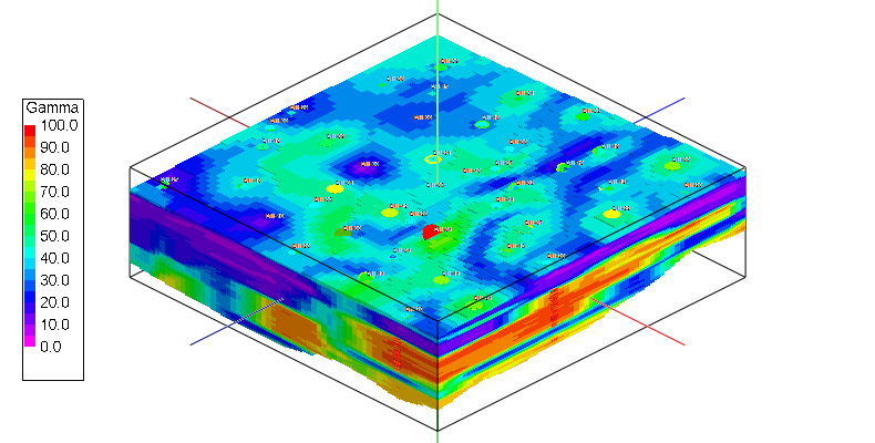 RockPlot3D の新規タブにブロックモデルが表示されます。このモデルは、先ほど表示したベンゼンモデルとはやや異なっていることに注意してください。これは、ビューの作成時に All Voxels オプションが選択されたためです。ステップ1で等値面を作成したのと同様の方法で、Gamma Model から特定の値を除外できます。