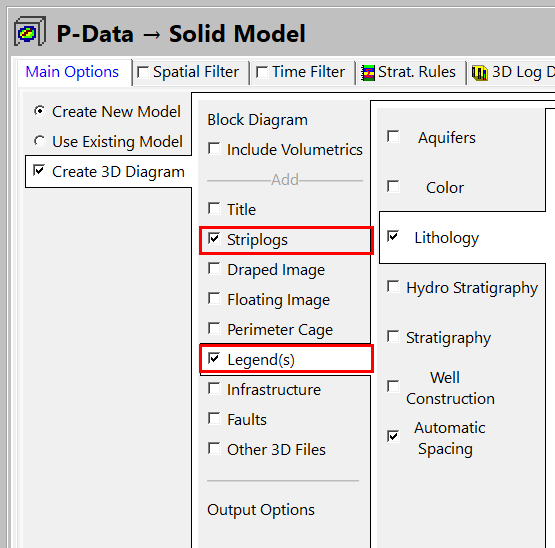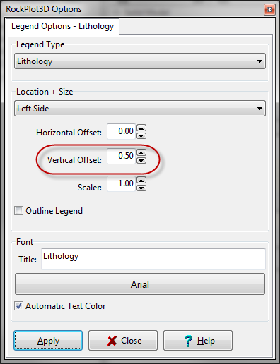 RockPlot3D ウィンドウ内で、Lithology 凡例はページ上部へ移動します。このウィンドウでは、凡例の位置、サイズ、フォントスタイルなども変更できます。