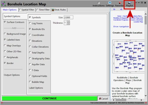 RockWorks のメインプログラムウィンドウにある Playlist タブは、プログラム内で頻繁に行うタスクを自動化するために使用します。たとえば、新しいプロジェクトに着手し、ボーリング孔の位置マップ、ストリップログセクション、そして、汚染物質の高値を示す T-Data Statistics マップを作成するとします。サンプルやモニタリング井戸を新たに追加すると、ボタンをクリックするだけで、これらのマップとダイアグラムを同じ設定で再実行できます。