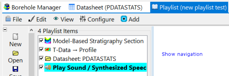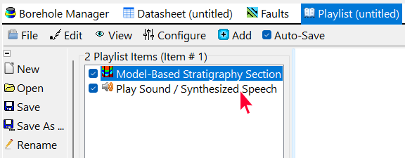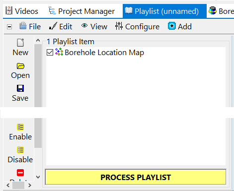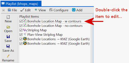 プログラムウィンドウのボタンをクリックするだけで、アイテムをプレイリストに追加できます。例えば、Borehole Location Map ウィンドウの Playlist ボタンをクリックすると…