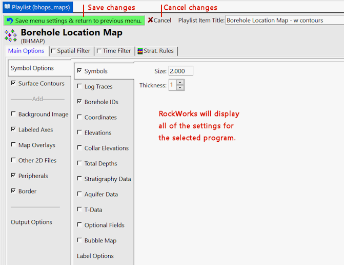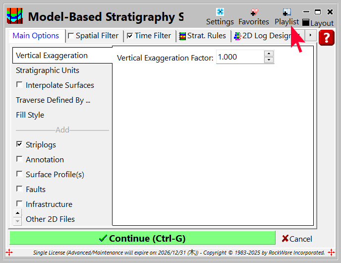- + PlayList アイコンをクリックすると、現在のプレイリストにアクティブなプログラムとその設定を簡単に追加できます。プレイリストは RockWorks のメインウィンドウの Playlists タブに表示されます。そこからプレイリストの表示、編集、保存も行うことができます。
