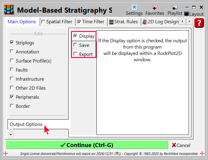 - プログラムウィンドウに戻り、この時点で出力を作成する場合は Continue ボタンをクリックします。RockWorks のメインウィンドウに戻る場合は「キャンセル」ボタンをクリックします。