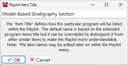 - RockWorks は、このアイテムにタイトルを割り当てるように促します。デフォルトのタイトルは、追加したプログラムによって決まります(例:「Model-Based Stratigraphy Section」)。このタイトルは、プレイリスト内でこのアイテムを識別するために使用されます。