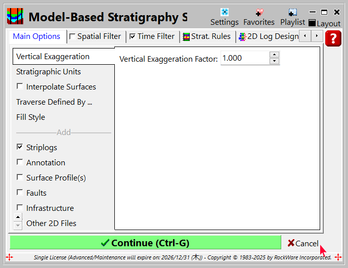 - プレイリストに追加したいメニューオプションを選択します。例えば、地層のクロスセクションをプレイリストに追加したい場合は、Stratigraphy | Section | Model-Based メニューオプションをクリックして、このプログラムウィンドウを開きます。