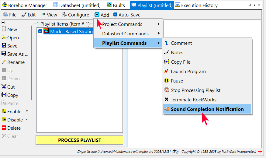 作成したプレイリストは、RockWorks の高度な “Command Scripts” の開始点として使用できます。