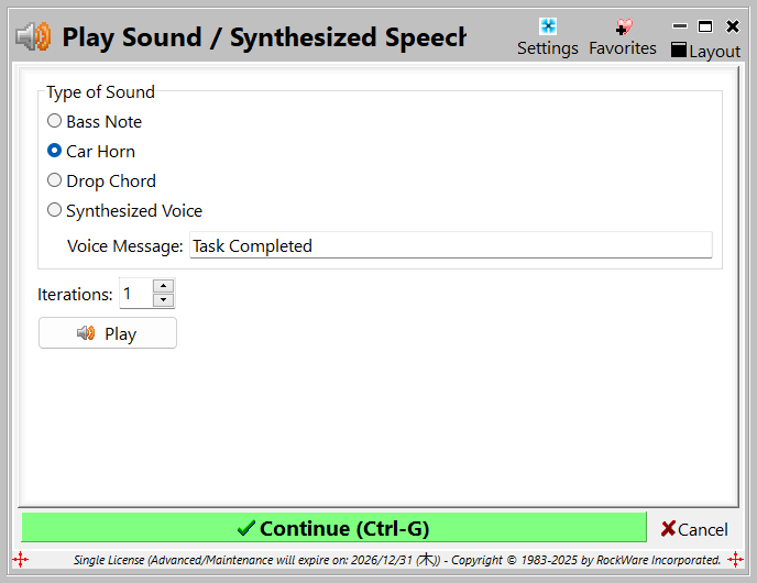 - 前の手順で追加した Play Sound/Synthesized Speech アイテムをクリックして、選択状態にして編集できるようにします。