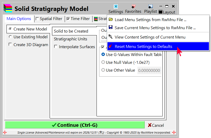 - このプログラム (Model-Based Stratigraphy Section) で実行するメニュー設定を確立/確認します。