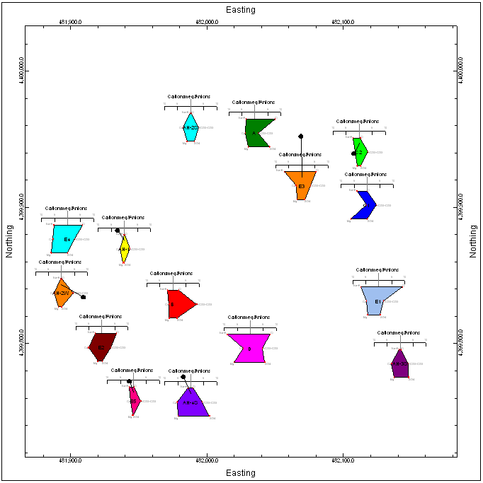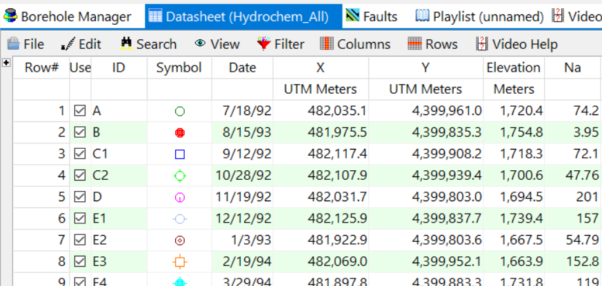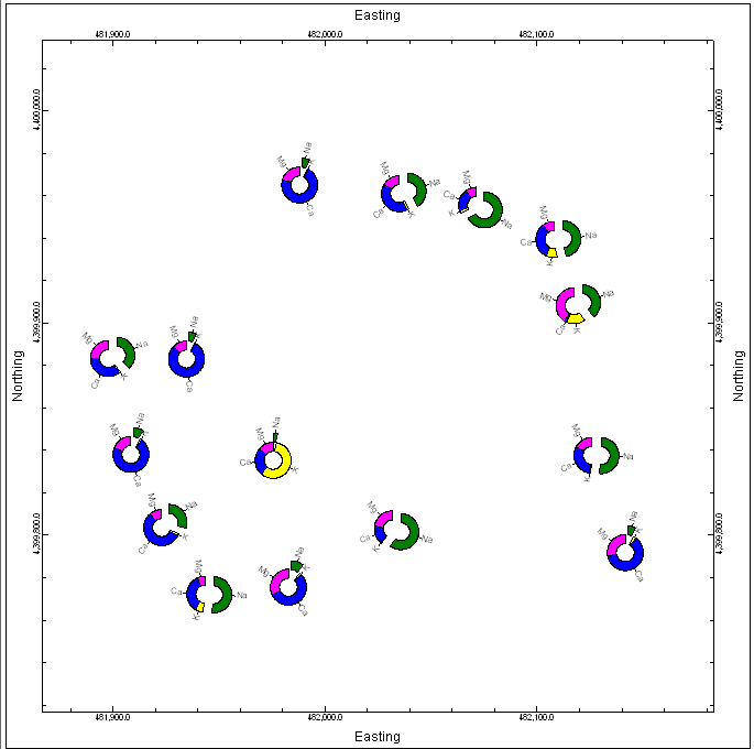 この演習のステップでは、Borehole Manager で地層面用に作成されるものと同様の RwGrd モデルに基づいて等高線を作成します。この領域の Sodium (ナトリウム) 濃度を示すマップを作成しましょう。