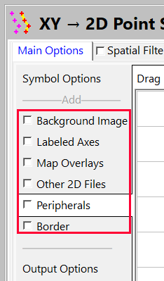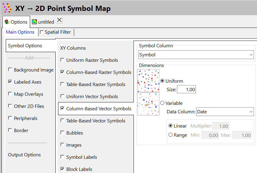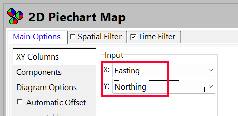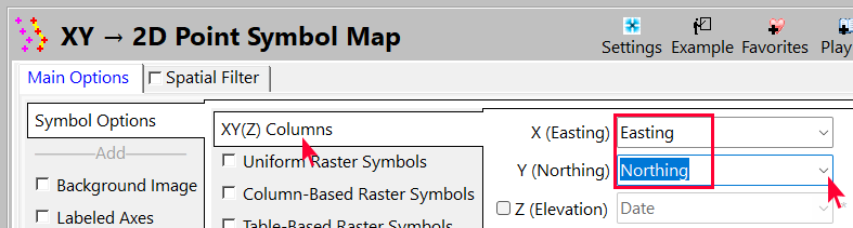 - Main Options | Symbol Options | XY Columns で、さきほど定義した Easting と Northing の位置に対応する各列を選択します。