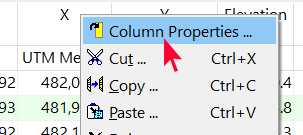 - 「X」というラベルの付いた列ヘッダーセルを右クリックし、Column Properties オプションを選択します。ウィンドウの右側にメニューが開きます。