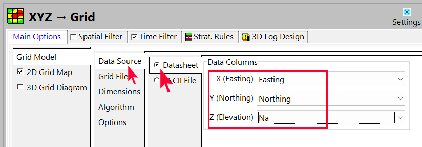 Datasheet を選択し、Easting と Northing に対応する列を選択します。Z (Elevation) には Na を指定します。
