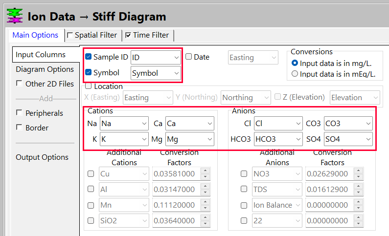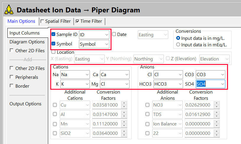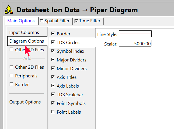 - Diagram Options をクリックし、TDS Circles (総溶解固形物)、Dividers (区切り線)、Titles (タイトル)、Labels (ラベル) などをプロットするための各種オプションを確認します。