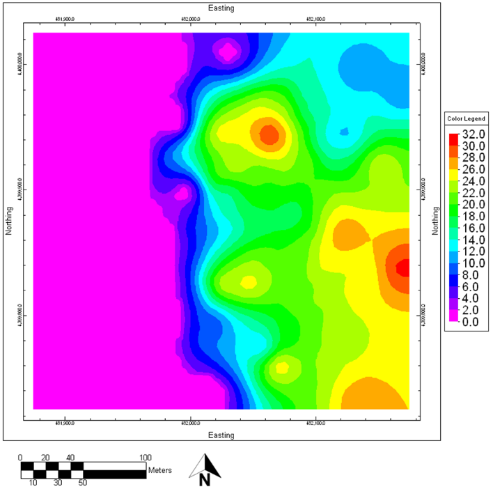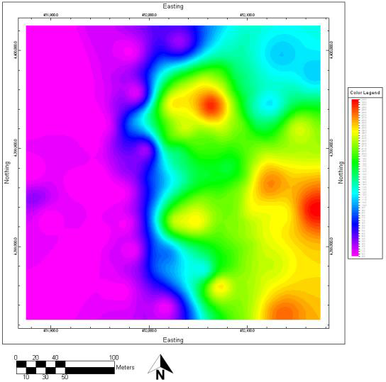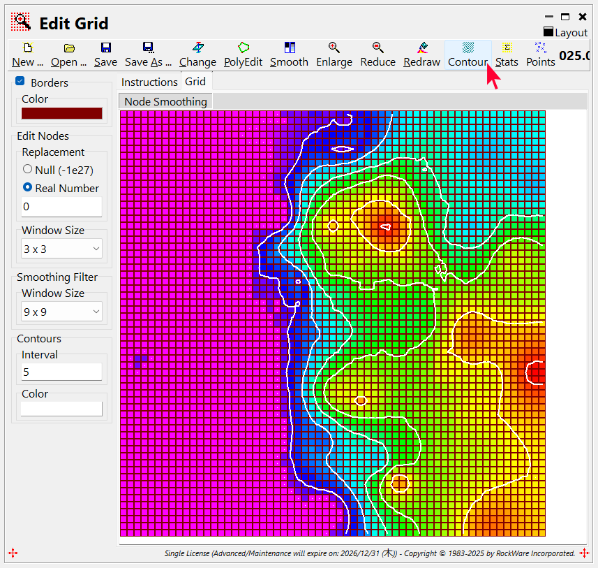 - Grid & Grid Math ウィンドウに戻り、ステップ1で作成した等層厚線マップを詳しく確認します。