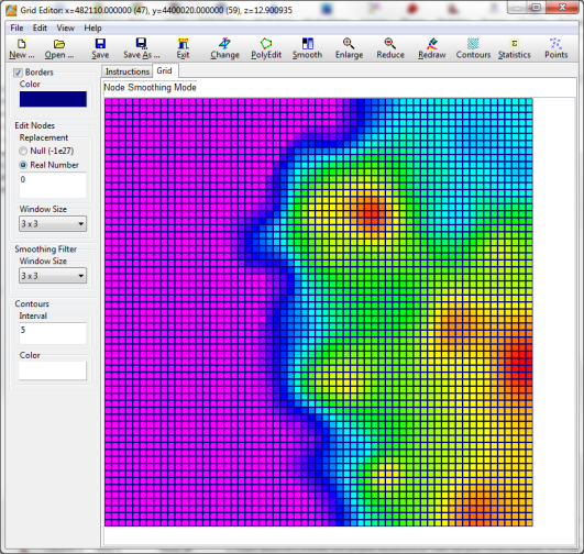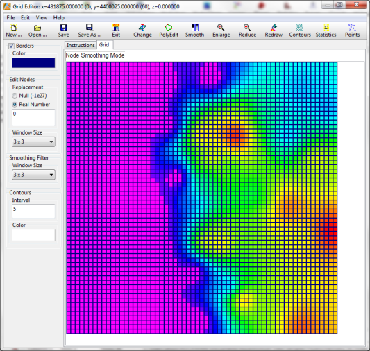 グリッドに変更を加える際は、画面上部の Contour ボタンを使って、等高線がどのように表示されるかをプレビューできます。変更が完了したら、Save As ボタンをクリックして、新しい.RwGrd ファイルを保存します。新しいグリッドの名称は Leadville Ls_Isopach_Edited.rwgrd とします。変更したグリッドを保存したら、グリッドエディターを閉じます。