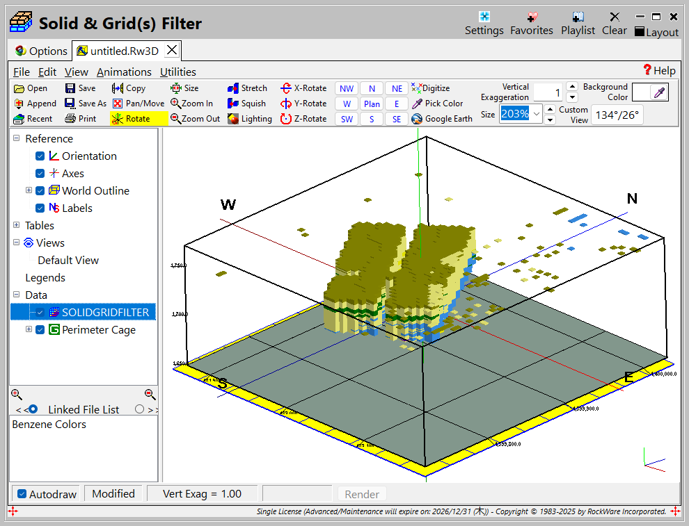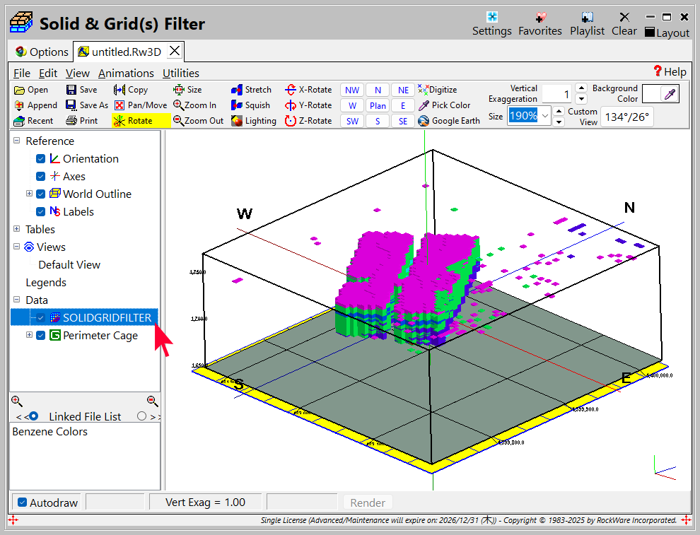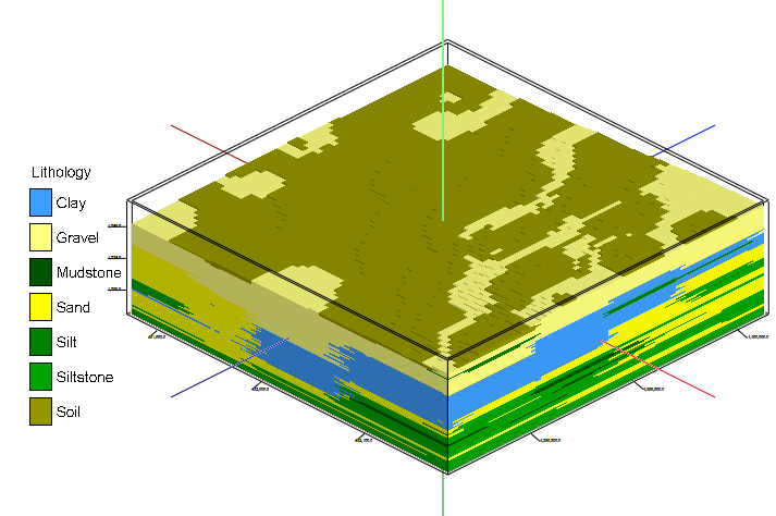 - フィルタリングされたモデルは、最初は Hot から Cold へのグラデーションカラースキームで表示されます。これを、岩相タイプテーブルと同じ色で表示されるように調整するには、データツリーの SOLIDGRIDFILTER アイテムをダブルクリックしてください。