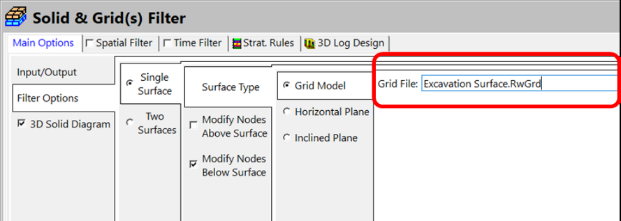 Grid Model オプションを選択し、Grid File に Excavation Surface.RwGrd を指定します。