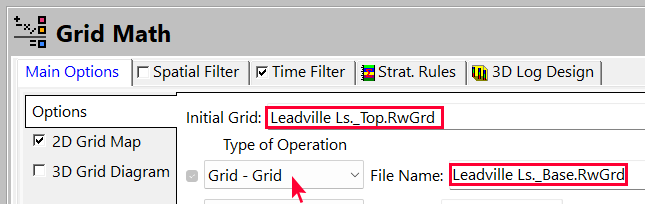 - Initial Grid に Leadville Ls._Top.RwGrd を選択し、Type of Operation の最初の行を Grid – Grid に変更して、Leadville Ls._Base.RwGrd を選択します。