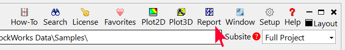- RockWorks のメインウィンドウで、プログラム画面の右上隅にある Report ボタン