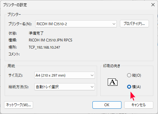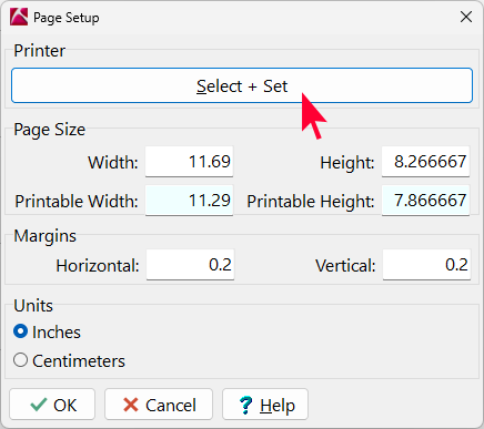 - File | Page Setup を選択し、Printer | Select + Set ボタンをクリックします。印刷の向きを「横」に変更します。表示されるオプションは、お使いのプリンタによって異なります。「OK」をクリックして「ページ設定」ウィンドウに戻ります。「OK」をクリックして「ReportWorks」ウィンドウに戻ります。