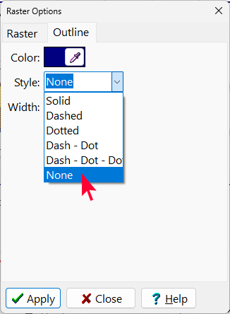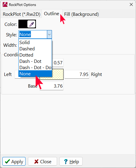 - Outline:ウィンドウ上部にある Outline タブをクリックします。Style をドロップダウンメニューを使用して Solid から None に変更します。
