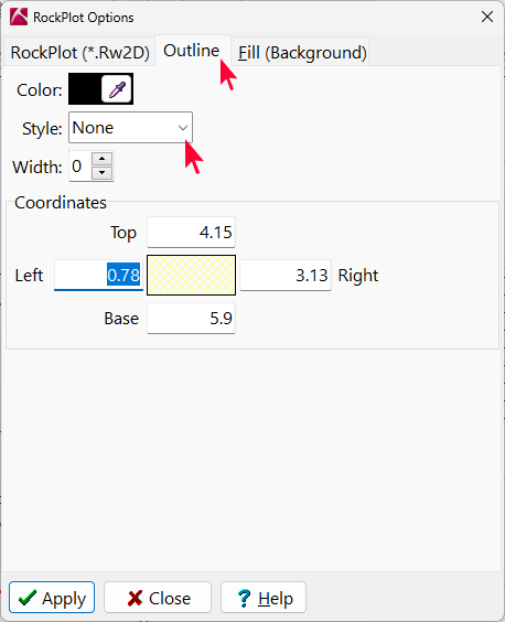 - Outline:ウィンドウ上部の Outline タブをクリックします。下矢印ボタンをクリックして、Style を None (なし) に設定します。