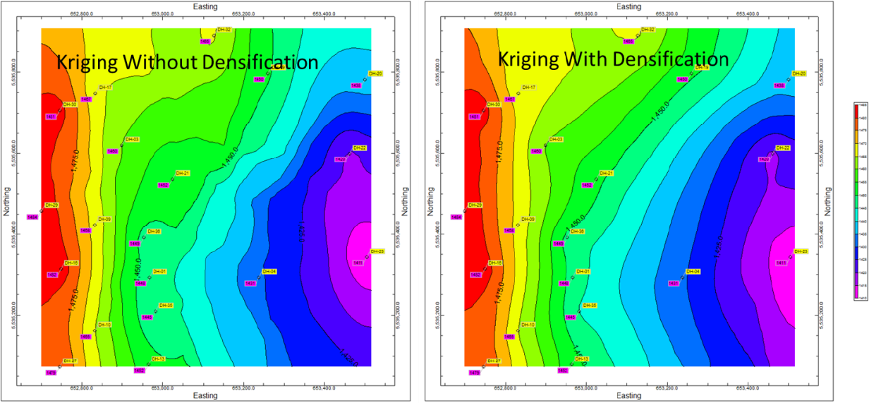 以下の図は、Inverse Distance (逆距離) 補間アルゴリズムを用いて作成された等高線マップについて、Densify オプションをオンとオフにしたときの違いを比較したものです。Densify 処理(三角測量による補間の前にデータセットにコントロールポイントを追加する処理)により、等高線が直線化され、データポイントとの整合性が向上していることに注目してください。