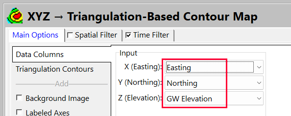 - Easting と Northing を適切な列で参照するように、データ列を設定します。Z 列には GW Elevation を選択します。