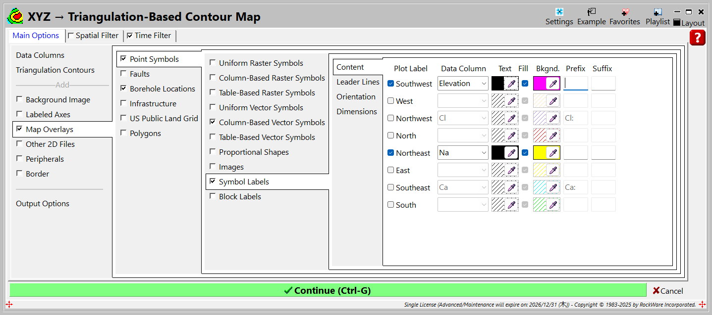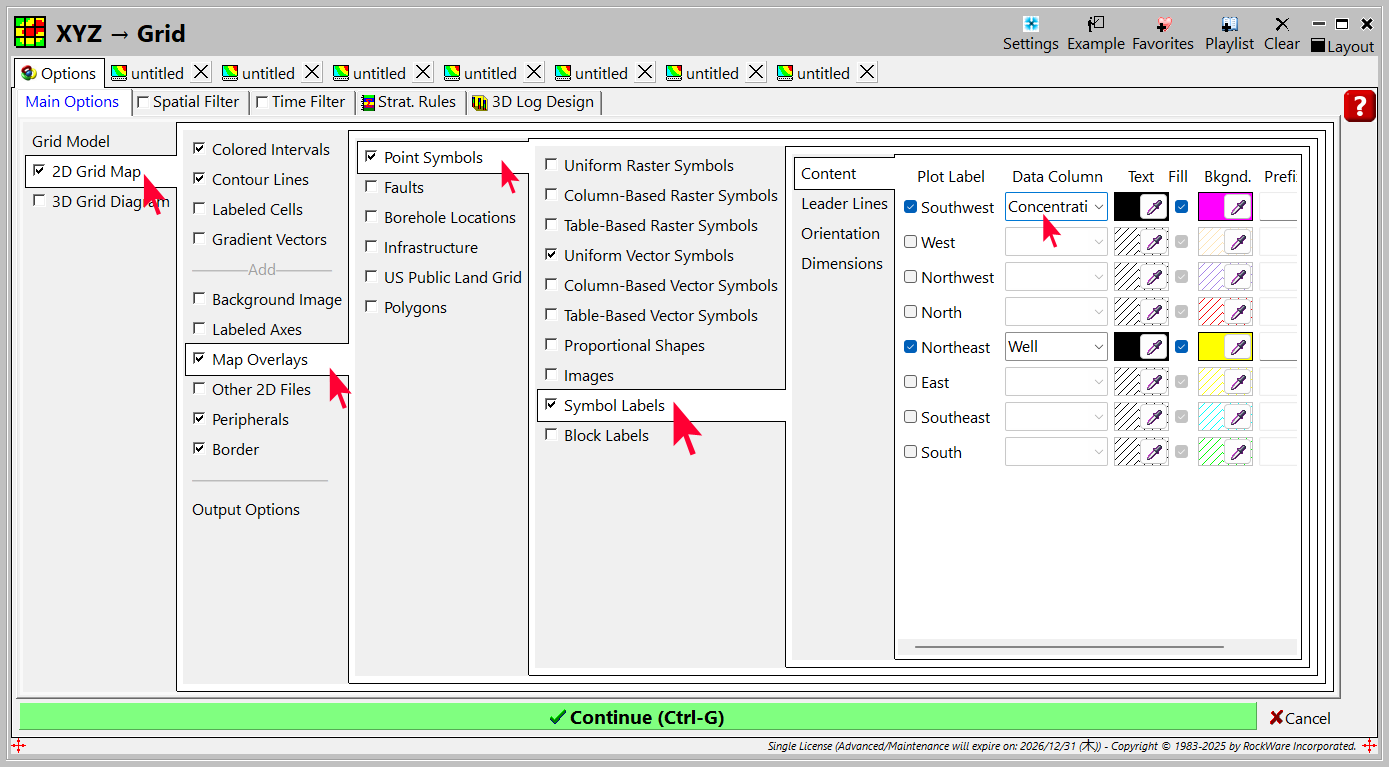 - 2D Grid Map | Map Overlays | Point Symbols | Symbol Labels を選択し、Southwest のラベル GW Elevation を Concentration に変更します。