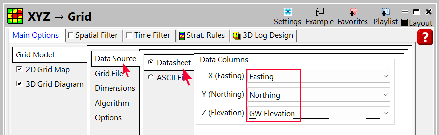 - Data Source タブで、Datasheet の列に適切な列 (X: Easting, Y: Northing) を指定します。Z (Elevation) 列には GW Elevation を指定します。