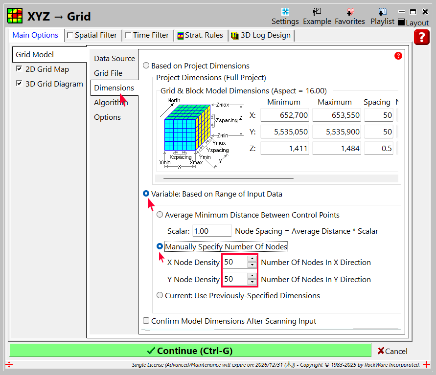 Variable (Based On Data Coordinates) オプションを選択します。Manually Specify Number of Nodes をクリックして、Node Density を 50 に設定します。※重要:このデータセットは定義されたプロジェクト ディメンションの内側にありません。