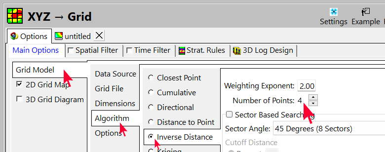 - Grid Model | Algorithm をクリックします。Inverse Distance Interpolation で使用する Number of Points を 8 から 4 に変更します。
