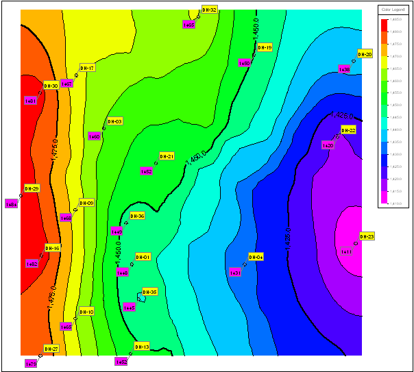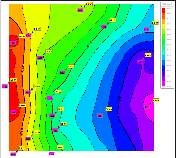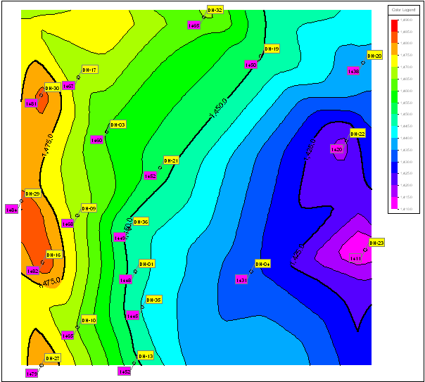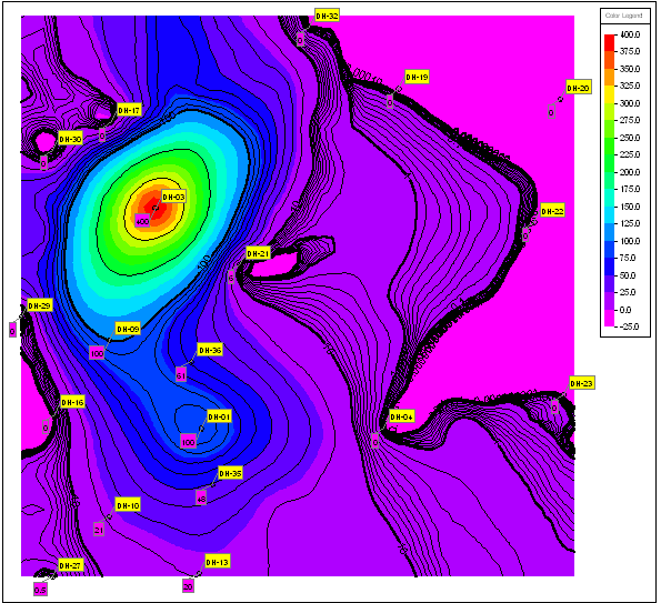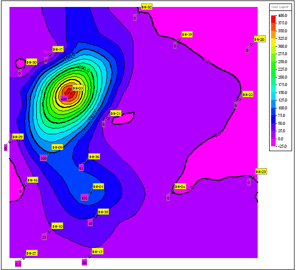 この演習では、RockWorks Utilities プログラムを使用して、まばらな地下水位と濃度のデータの等高線マップを作成するためのいくつかの「コツ」について説明します。