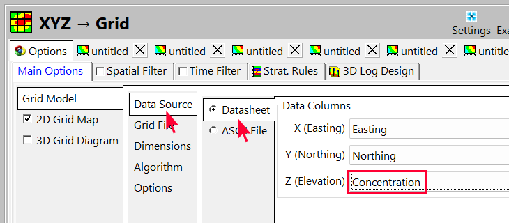 - XYZ → Grid ウィンドウで、Grid Model | Data Source をクリックし、Z (Elevation) 列を Concentration に変更します。