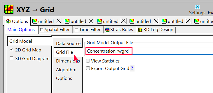 - Grid File をクリックして、アウトプットするグリッドファイルの名称を Concentration.rwgrd に変更します。
