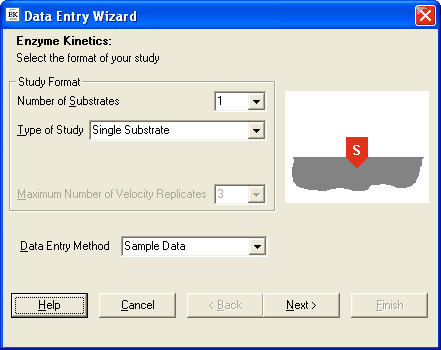 Data Entry Wizard が表示されます。Data Entry Wizard の最初の画面で Number of Substrates (基質数)、Type of Study (研究タイプ)、Data Entry Method (データの入力方法) を選択します。
