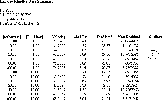 - Enzyme Kinetics Data Summary と名付けられたセクションまでスクロールダウンします。Outlier という見出しの下に外れ値が表示されます。以下の図では、外れ値が丸く囲んで示されています。