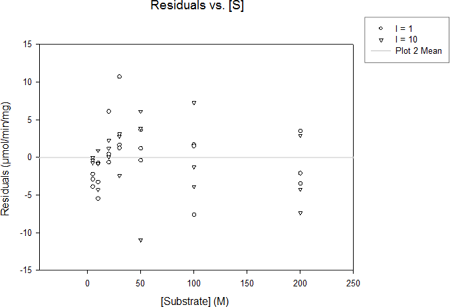 Regression Wizard (回帰ウィザード) で選択したモデルをあてはめる場合、パラメータ推定値と、あてはめられる応答の一連の値が計算されます。Residual Graph マクロは、実測値から従属変数 (反応) のあてはめ値を引いて残差の値を求めます。