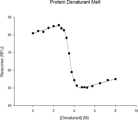 y vs. [Denaturant] グラフは、[変性剤 (Denaturant)] と反応 (y) の関係をプロットします。