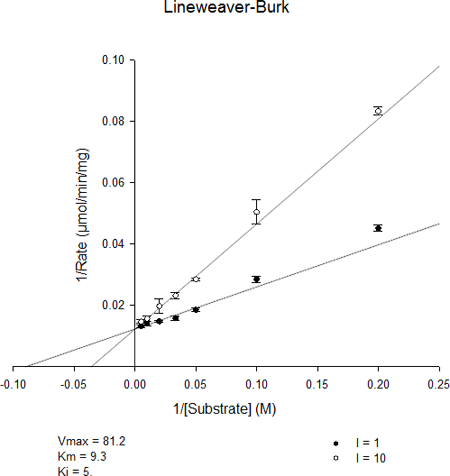 ラインウィーバー=バーク・プロット (二重逆数プロット) は、反応の初速度の逆数 (1/v) を基質濃度の逆数 (1/[s]) に対してプロットするものです。このプロットは、酵素反応速度論の診断向けに最も広く使用されているプロットです。